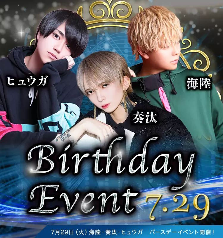2025.10.31 7月29日|合同バースデーイベント開催! \\3人主役で、テンションも3倍// Birthday Event 👑ヒュウガ 👑奏汰 👑海陸 大人の余裕と全力のはしゃぎ、両方アリ!✨ 今夜は遠慮なく、お祝いモード全開で🎉 🗓 7.27(日) 📍ホストクラブ大阪男塾本店